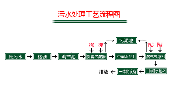 污水通過格柵渠自流進(jìn)入調(diào)節(jié)池(業(yè)主土建),調(diào)節(jié)池內(nèi)的污水通過設(shè)置的污水泵抽取進(jìn)入斜管沉淀器,在泥渣懸浮層上方安裝傾角60度的斜管組件,使原水中的懸浮物、固體物或經(jīng)投加混凝劑后形成的絮體礬花,在斜管底側(cè)表面積積聚成薄泥層,依靠重力作用滑回泥渣懸浮層,繼而沉入集泥斗。出水進(jìn)入中間水池1,經(jīng)泵提進(jìn)入溶氣氣浮機(jī),由空氣壓縮機(jī)送到空氣罐中的空氣通過射流裝置被帶入溶氣罐,在0.35Mpa壓力下被強(qiáng)制溶解在水中,形成溶氣水,送到氣浮槽中。在突然釋放的情況下,溶解在水中的空氣析出,形成大量的微氣泡群,同泵送過來的并經(jīng)加藥后正在絮凝的污水中的懸浮物充分接觸,并在緩慢上升過程中吸附在絮集好的懸浮物中,使其密度下降而浮至水面,達(dá)到去除SS和CODcr的目的。出水自流進(jìn)入中間水池2,經(jīng)泵提進(jìn)入一體化設(shè)備,A/O工藝將前段缺氧段和后段好氧段串聯(lián)在一起,A段DO不大于0.2mg/L,O段DO=2~4mg/L。在缺氧段異養(yǎng)菌將污水中的淀粉、纖維、碳水化合物等懸浮污染物和可溶性有機(jī)物水解為有機(jī)酸,使大分子有機(jī)物分解為小分子有機(jī)物,不溶性的有機(jī)物轉(zhuǎn)化成可溶性有機(jī)物,當(dāng)這些經(jīng)缺氧水解的產(chǎn)物進(jìn)入好氧池進(jìn)行好氧處理時(shí),可提高污水的可生化性及氧的效率;在缺氧段,異養(yǎng)菌將蛋白質(zhì)、脂肪等污染物進(jìn)行氨化游離出氨(NH3、NH4+),在充足供氧條件下,自養(yǎng)菌的硝化作用將NH3-N(NH4+)氧化為NO3-,通過回流控制返回至A池,在缺氧條件下,異氧菌的反硝化作用將NO3-還原為分子態(tài)氮(N2)完成C、N、O在生態(tài)中的循環(huán),實(shí)現(xiàn)污水達(dá)標(biāo)排放