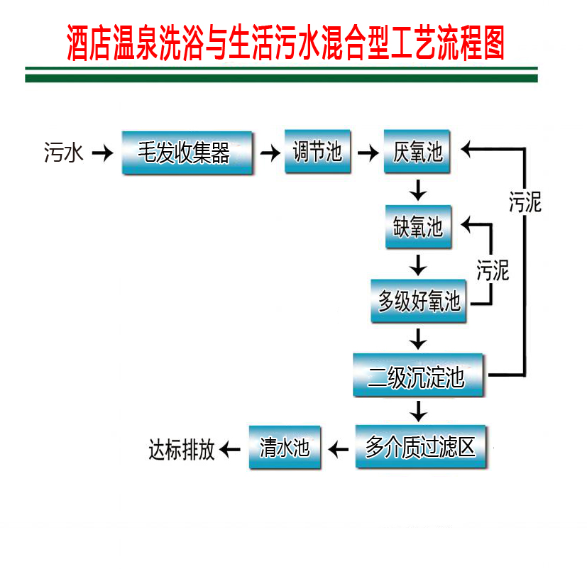 首先通過毛發(fā)收集器攔截,對(duì)污水進(jìn)行預(yù)處理,目的是初步降低無機(jī)顆粒物質(zhì)的含量,提高污水的同一性和可生化性;接著由提升泵定量提升至調(diào)節(jié)池進(jìn)行水質(zhì)水量的調(diào)節(jié),經(jīng)調(diào)節(jié)后的污水通過缺氧好氧A/O/O/O生物接觸氧化法,利用生物膜的作用使有機(jī)污染物首先轉(zhuǎn)化為氨氮,同時(shí)通過好氧硝化和缺氧反硝化過程既去除有機(jī)物又去除了氨氮。生化池配以新型的高密型彈性立體填料,該填料具有負(fù)荷高、施工簡易、體積小、運(yùn)行穩(wěn)定可靠、管理方便、維修更換方便等優(yōu)點(diǎn);生化池的出水進(jìn)入二沉淀池進(jìn)行固液分離,二沉淀池具有固液分離效果好、投資省、對(duì)沖擊負(fù)荷和溫度變化適應(yīng)能力強(qiáng)、施工簡易等特點(diǎn);二沉淀池出水進(jìn)入多介質(zhì)過濾器除去水中雜質(zhì),經(jīng)多介質(zhì)過濾區(qū)處理后能確保污水經(jīng)處理后各項(xiàng)指標(biāo)全面達(dá)標(biāo)。