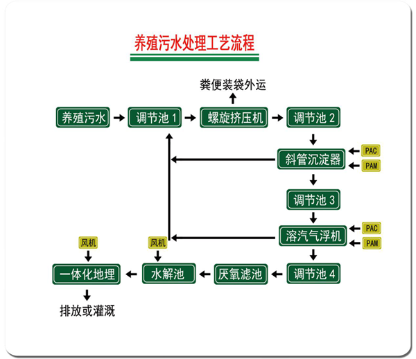 污水集中收集進(jìn)入調(diào)節(jié)池1,在調(diào)節(jié)池1進(jìn)行水質(zhì)水量的調(diào)節(jié),經(jīng)泵入螺旋擠壓機(jī),擠壓后的干糞堆糞裝袋做肥料。出水進(jìn)入調(diào)節(jié)池2,在調(diào)節(jié)池2進(jìn)行水量均衡,經(jīng)泵進(jìn)入斜管沉淀器,加入PAM、PAC進(jìn)行絮凝沉淀,污泥排入調(diào)節(jié)池1,出水進(jìn)入調(diào)節(jié)池3進(jìn)行水質(zhì)水量的調(diào)節(jié),經(jīng)泵入溶汽氣浮機(jī),氣浮機(jī)產(chǎn)生的小氣泡配合PAC、PAM共同作用將污水中的大部分有機(jī)物以懸浮物的形式去除,浮渣和底部污泥排入調(diào)節(jié)池1。出水進(jìn)入調(diào)節(jié)池4,在調(diào)節(jié)池4進(jìn)行水質(zhì)水量泵入?yún)捬鯙V池將污水中大的分子鏈打斷減輕后續(xù)好氧的負(fù)荷,出水通過水解池內(nèi)設(shè)置的泵進(jìn)入一體化地埋設(shè)備,經(jīng)過地埋的生化處理后降解吸附污水中的有機(jī)物出水排放或做灌溉用。